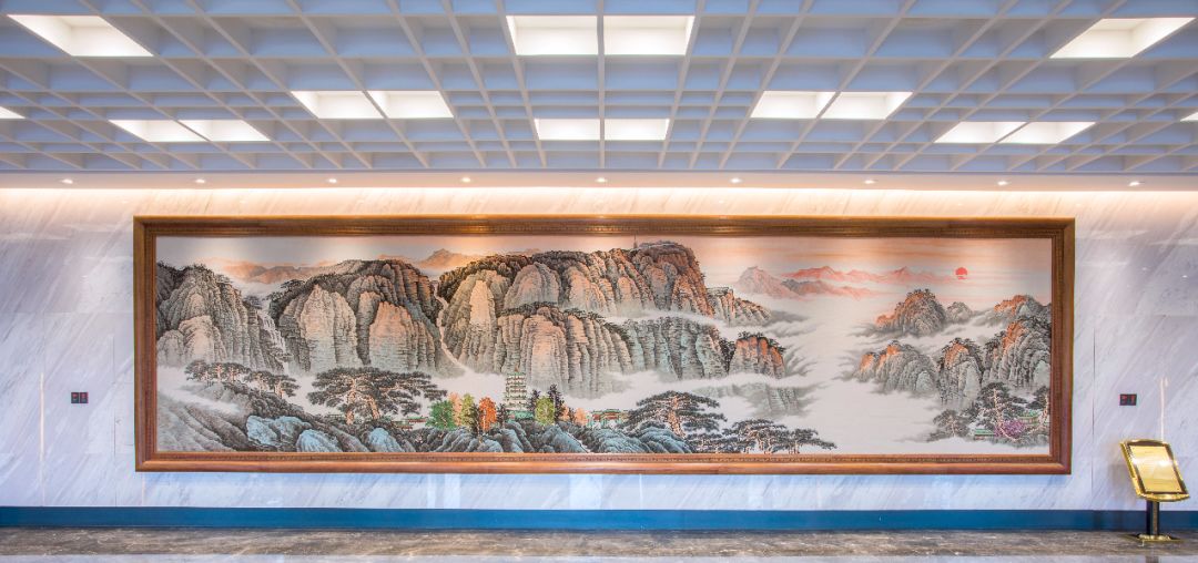 《紫气东来》艺术挂毯由山东威海市海马地毯集团有限公司制造,取材中国传统写意山水画。采用现代挂毯工艺,以光泽华贵的真丝和优质的新西兰羊毛为原料,由498中颜色搭配展现出逾千种色彩变化,经数十位资深计师历时10月精雕细琢而成。作品核心部分长11.4米高2.7米重约1.8吨。无论规模之宏大还是工艺之精湛都堪称国画提材挂毯之最。完美的呈现了五岳之尊泰山的雄伟壮丽,气势磅礴与友谊宾馆厚重的历史传承,博大的精神积淀相得益彰。